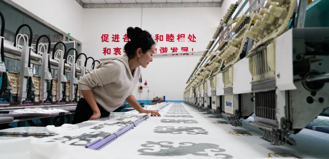 “阿娜爾,走,上班去!”“好的姐妹,走!今天咱們刺繡廠可是又接了個(gè)來(lái)自烏魯木齊的大活!可得抓緊!”近日一大早,木壘縣博斯坦鄉(xiāng)博斯坦村的村民阿娜爾就被同事從家中叫走,趕往鄉(xiāng)里的木拉民族手工藝品有限責(zé)任公司上班。