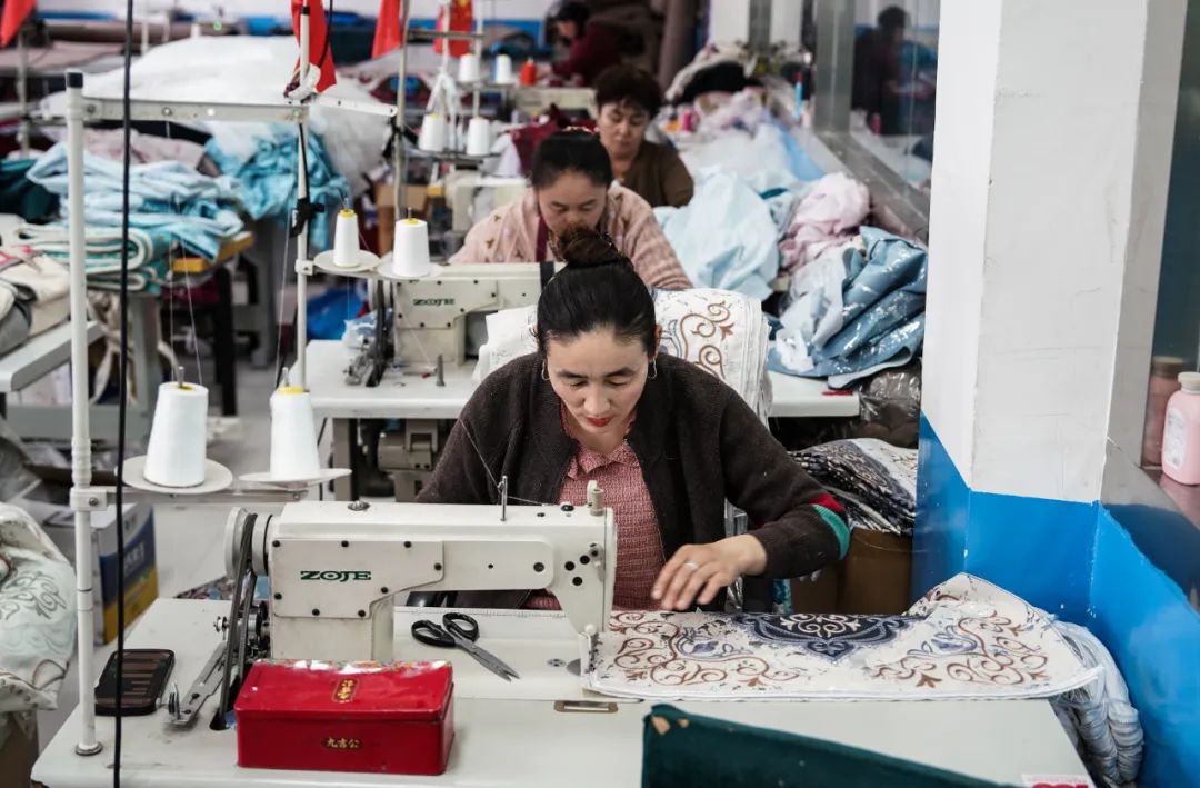 步行5分鐘,公司就在鄉(xiāng)政府大院內(nèi),這里有和阿娜爾一樣的62名同事,她們有個(gè)統(tǒng)一的稱謂——繡娘。