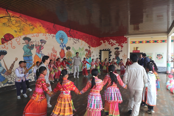 當(dāng)天,恰逢孩子們“過(guò)六一”兒童節(jié),身著傈僳族盛裝的孩子們載歌載舞,向志愿者們展現(xiàn)傈僳族獨(dú)特的文化魅力。伴隨著悠揚(yáng)的旋律,志愿者與孩子們手挽手、心連心,踏著歡快節(jié)拍共舞,現(xiàn)場(chǎng)歡聲笑語(yǔ)此起彼伏,讓民族團(tuán)結(jié)之花在校園里盡情綻放。