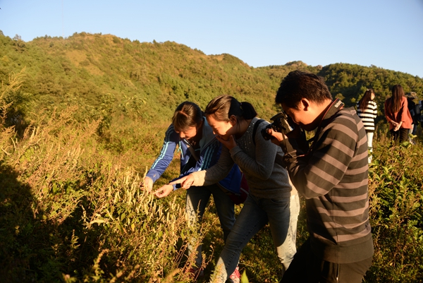 “剛才發(fā)現(xiàn)了一個孢子,碰打它會冒出煙霧狀的粉末,那就是生殖細胞器官?!薄白约簩嵺`才明白百聞不如一見!”具象化的自然體驗,打破了課本的邊界,高一年級學生楊集升、楊禮碩和各年級不同班級的同學在山脊線與雨露之間快樂地捕捉生命的密鑰,收獲著驚喜。