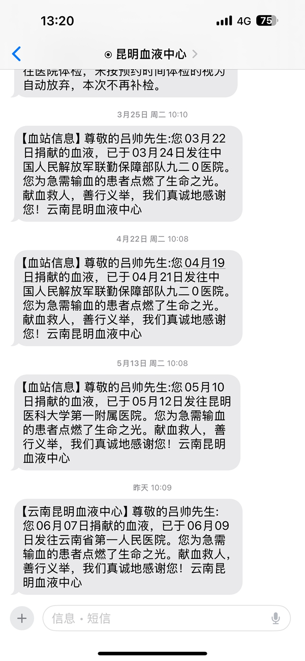 他記不清從哪一年起,云南昆明血液中心開始推出了一項(xiàng)貼心的短信服務(wù)。每當(dāng)他完成一次獻(xiàn)血后,大約兩三天便能收到一條溫馨的短信,告知他捐獻(xiàn)的血液已在某月某日發(fā)往了某某醫(yī)院,為那里的患者帶去了生命的希望。