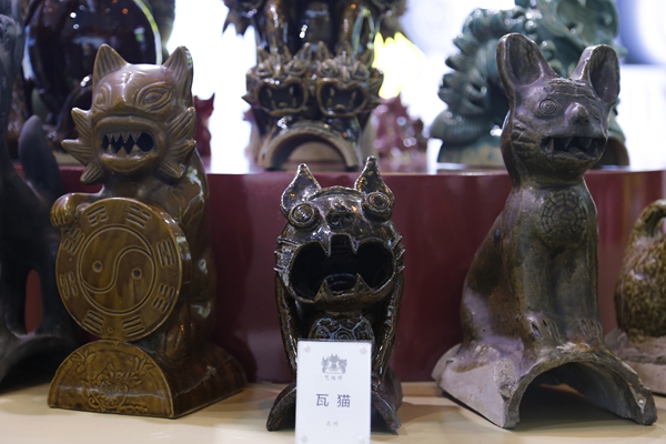 在“旅居云南館”的非遺瓦貓展臺(tái)前,形態(tài)各異、色彩艷麗的瓦貓吸引了眾多參觀者駐足。