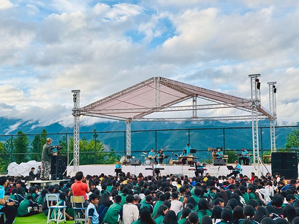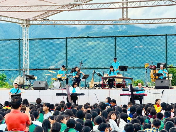 結(jié)束了小學(xué)的國(guó)樂(lè)課,當(dāng)天下午,志愿服務(wù)隊(duì)一行又來(lái)到了綠春縣戈奎中學(xué)足球場(chǎng),為當(dāng)?shù)?500余名師生帶來(lái)了一場(chǎng)國(guó)樂(lè)的饕餮盛宴。哀牢山般蒼茫的笛聲穿透薄霧,哈尼童謠《梯嚕?!返臍g快節(jié)奏隨山風(fēng)跳躍。《魯冰花》“夜夜想起媽媽的話”在漸濃的暮色與氤氳水汽中響起,歌聲溫柔,不少孩子悄悄拭去眼角的晶瑩。校長(zhǎng)李勇勤凝望全場(chǎng),動(dòng)情道:“這歌聲,是給父母遠(yuǎn)行孩子們最溫暖的擁抱。”