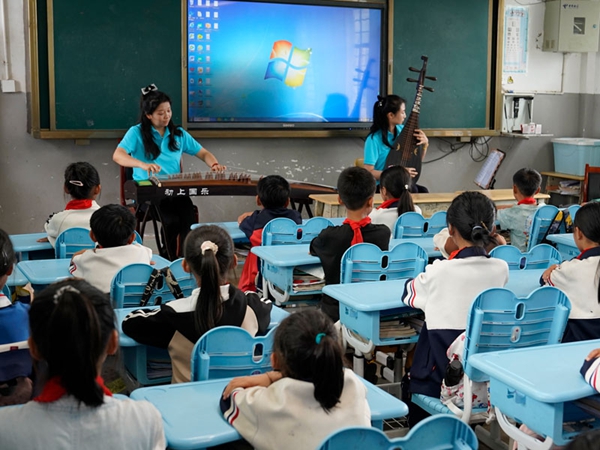 老師們現(xiàn)場(chǎng)給同學(xué)們展示,并介紹了這些樂(lè)器的相關(guān)知識(shí),還為同學(xué)們演奏了《十面埋伏》《高山流水》等多首名曲。山里的孩子第一次聽(tīng)到中國(guó)傳統(tǒng)樂(lè)器現(xiàn)場(chǎng)演奏,欣喜萬(wàn)分,老師也讓同學(xué)們親手觸摸琴弦,體驗(yàn)樂(lè)器發(fā)聲。“聽(tīng),這是《戰(zhàn)臺(tái)風(fēng)》里大海的咆哮!”老師撥動(dòng)箏弦,窗外正逢大雨來(lái)襲,彼時(shí)風(fēng)暴聲驟起,孩子們睜大的眼中映著驚奇與山雨欲來(lái)的天光。而當(dāng)《采蘑菇的小姑娘》輕快的旋律響起,前排的小男孩忍不住隨著節(jié)奏揮手“采擷”——悠遠(yuǎn)的國(guó)樂(lè),此刻化作山巔流云,輕柔飄落進(jìn)孩子們被青山綠水浸潤(rùn)的童年。