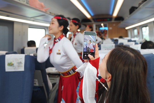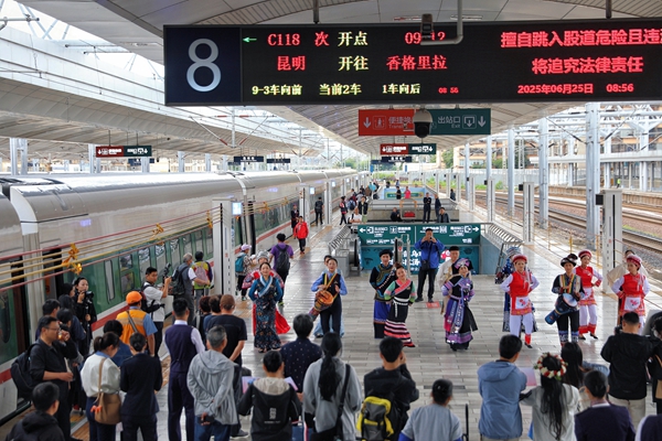 6月25日8時45分,昆明站沐浴在金色的朝陽中。昆明至麗江C118次“復(fù)興號”動車組前,身著彝族、白族、藏族等絢麗民族服飾的乘務(wù)員們喜迎旅客,一場以“一路茶香,和美通途”為主題的服務(wù)提質(zhì)行動正式拉開帷幕。