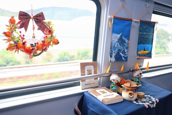 走進(jìn)車廂,濃郁的民族文化氣息撲面而來。8節(jié)車廂分別呈現(xiàn)彝族、白族、納西族、藏族4個民族主題。商務(wù)座以東巴文、藏式民居為裝飾;餐吧車則以藏式風(fēng)格全面升級,懸掛馬幫鈴鐺,陳列普洱茶、烤茶、白族“三道茶”及特色文創(chuàng)品擺件。列車化身“茶馬古道民族文化長廊”,處處彰顯“一站一民族,一程一茶香”的文化特色。
