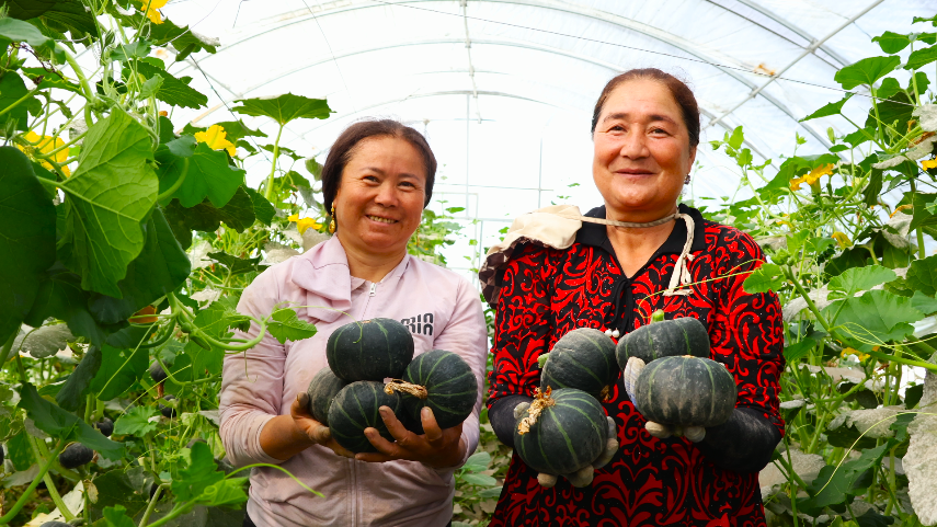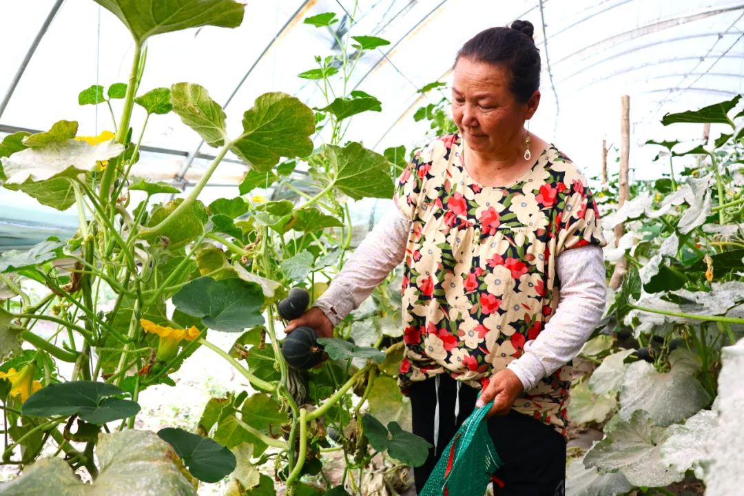 塔孜洪鄉(xiāng)貝貝南瓜種植大棚內(nèi),農(nóng)戶們穿梭在藤蔓間,仔細(xì)甄選著成熟的貝貝南瓜。
