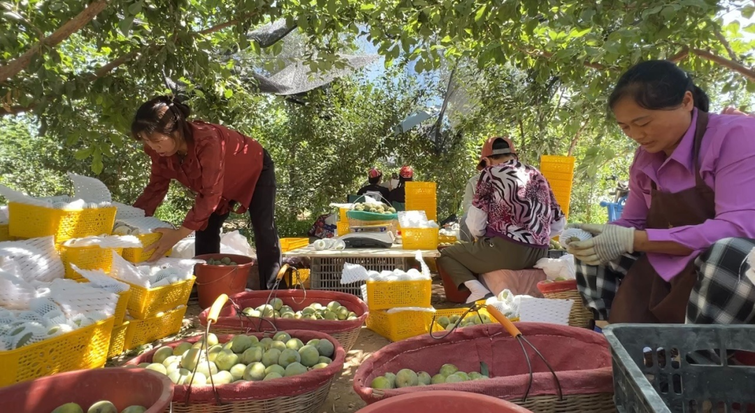 眼下正值杏李“恐龍蛋”成熟上市季節(jié)。近日,在阿克蘇市依干其鎮(zhèn)托萬克科克巴什村,“恐龍蛋”掛滿枝頭,果農(nóng)們穿梭林間,忙碌于采摘、分選、套袋、裝筐等環(huán)節(jié),現(xiàn)場有條不紊、熱火朝天。