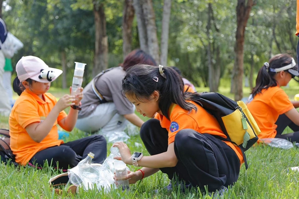 午后,隊(duì)伍轉(zhuǎn)場(chǎng)寶豐濕地保育區(qū),開啟探秘生態(tài)“自然課堂”。在濕地講解員的帶領(lǐng)下,觀察水域中的水生植物,并參與“植物凈水小實(shí)驗(yàn)”,通過模擬濕地植物根系吸附雜質(zhì)的過程,當(dāng)親眼見證渾濁水體在植物纖維與微生物的協(xié)同作用下逐漸澄清時(shí),大家恍然大悟:“原來(lái)這片綠茵環(huán)繞的水域,正是地球賴以呼吸的‘生態(tài)濾網(wǎng)’?!?/p>