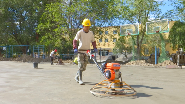 走進木壘縣中學(xué)初中部教育設(shè)施改造項目現(xiàn)場,工人們正頂著高溫打磨水泥地板,澆水保養(yǎng)地面。