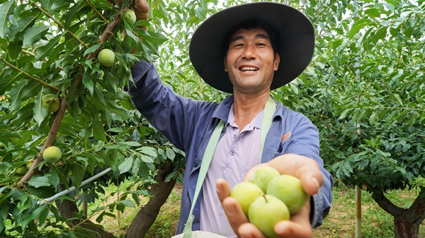 走進果園,果農(nóng)們穿梭于林間,正忙著采摘、分揀、裝桶、覆膜。每棵果樹上都掛著一些特制塑料瓶,上面附著著果蠅,青脆李卻是光潔飽滿。“這個瓶子主要用來防治果實蠅,保證果子質(zhì)量?!庇廊士h維的鄉(xiāng)么吉利村種植戶殷志維說。