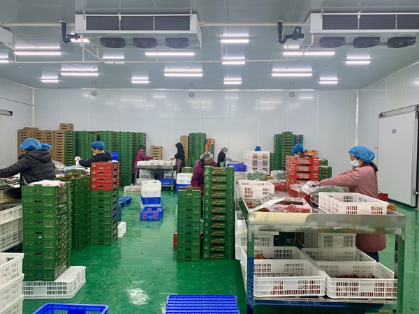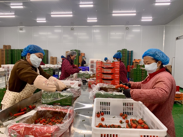 (工人對剛采摘的小番茄進(jìn)行分揀、裝筐)