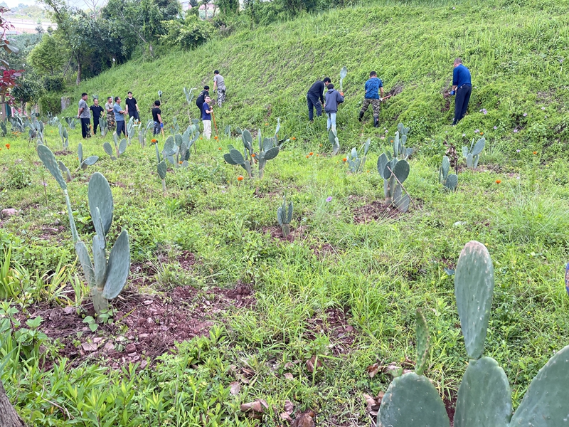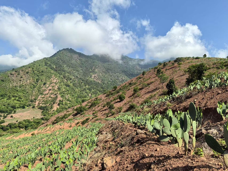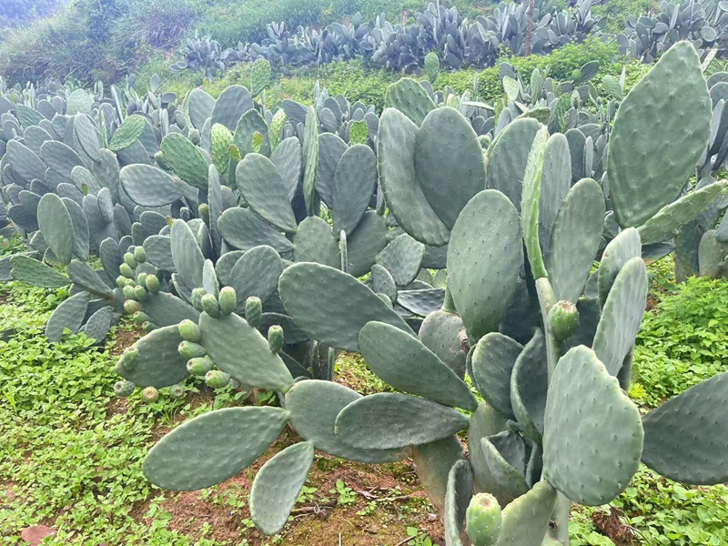 在云南省楚雄州雙柏縣獨田鄉(xiāng)下凹郎村的仙人掌種植基地里,一薹薹的仙人掌順著山勢綿延,沐浴著陽光,盡情舒展著寬闊的“手掌”,一個個鵝蛋大小的果實布滿葉片。這一片原本只能長出雜草和低矮灌木的荒山,因為漫山遍野的仙人掌,煥發(fā)出了新的生機。