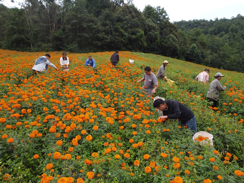 這幾天,萬壽菊也到了盛花期與采摘期,走進(jìn)雙柏縣法脿鎮(zhèn)月牙埂水庫,數(shù)十畝金黃的萬壽菊匯成壯觀花海,花海中間,村民們歡聲笑語采摘飽滿花朵,豐收喜悅在花香中飄蕩。萬壽菊經(jīng)濟(jì)價(jià)值高,是雙柏縣重點(diǎn)發(fā)展的陽光產(chǎn)業(yè),萬壽菊周期短、效益好,勞動(dòng)強(qiáng)度老人婦女都適宜。年內(nèi),雙柏縣種植萬壽菊12450畝,預(yù)計(jì)鮮花總產(chǎn)量4.4萬噸,預(yù)估產(chǎn)值4793萬元,真正成為群眾家門口的“致富花”。今年61歲的張秀英就在家門口找到了工作,她滿意地說:“沒想到我這個(gè)年紀(jì)還能在家門口務(wù)工,這里活計(jì)輕巧,工資每天100元,我這個(gè)年紀(jì)工資是算高的了,還離家近,我干著也開心?!?/p>