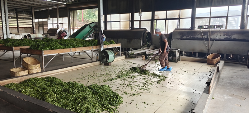 在白竹山腳下的茶葉加工廠也是一派忙碌景象,工人們正將當(dāng)天采摘的鮮葉進(jìn)行機(jī)械殺青、揉捻、烘干,每道工序緊張有序,加工廠的工人都是附近的村民。這是雙柏縣依托茶葉加工廠,把務(wù)工車間建到群眾家門口的新就業(yè)模式,這樣,農(nóng)閑時(shí)節(jié),群眾也能靠務(wù)工獲得可觀的收入。法脿鎮(zhèn)爛泥村委會(huì)爛泥村村民姚立相介紹道:“我的主要工作就是加工春茶和秋茶,我妻子負(fù)責(zé)采茶,我們夫妻倆一年在這里的務(wù)工收入有四萬多元,閑時(shí)還能管管家里,有這樣一份工作我們很知足。”