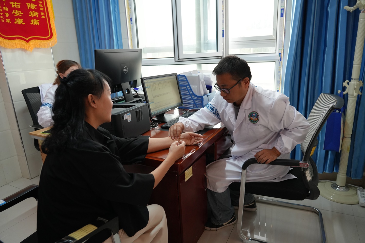 在張勇醫(yī)生辦公室里,十幾面錦旗掛滿了墻面,寫(xiě)著“大愛(ài)援疆醫(yī)德雙磬”、“關(guān)愛(ài)病患暖人心”等贊譽(yù)?;颊咭粋€(gè)接一個(gè)來(lái)到門診室,張勇醫(yī)生望聞問(wèn)切,精準(zhǔn)診斷病癥、病因,在紙張上寫(xiě)出藥方,給出用藥、飲食、情緒管理等多方面的指導(dǎo)。問(wèn)診的人,聲音里充滿信任。