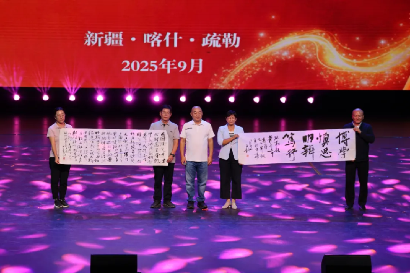 演出中途的書法作品捐贈儀式溫暖人心,當書法作品和書籍送至基層單位代表手中時,現(xiàn)場響起持久而熱烈的掌聲。疏勒縣文化體育廣播電視和旅游局黨組成員、副局長鄭霞作為受贈單位代表表示,將把這份文化自豪感和精神力量轉化為實際行動,引導大家多讀書、讀好書,不斷增強文化自信,積極傳承和弘揚中華優(yōu)秀傳統(tǒng)文化,為增強中華文化認同、服務國家文化強國戰(zhàn)略貢獻智慧與力量。