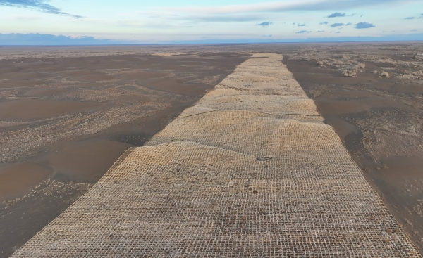 草方格沙障經(jīng)規(guī)整鋪設(shè)形成網(wǎng)格狀結(jié)構(gòu),有效增加地表粗糙度,顯著降低風(fēng)速,固沙成效突出。截至目前,準(zhǔn)噶爾盆地綠洲保護(hù)綜合治理項(xiàng)目——工程固沙任務(wù)已全面完成。