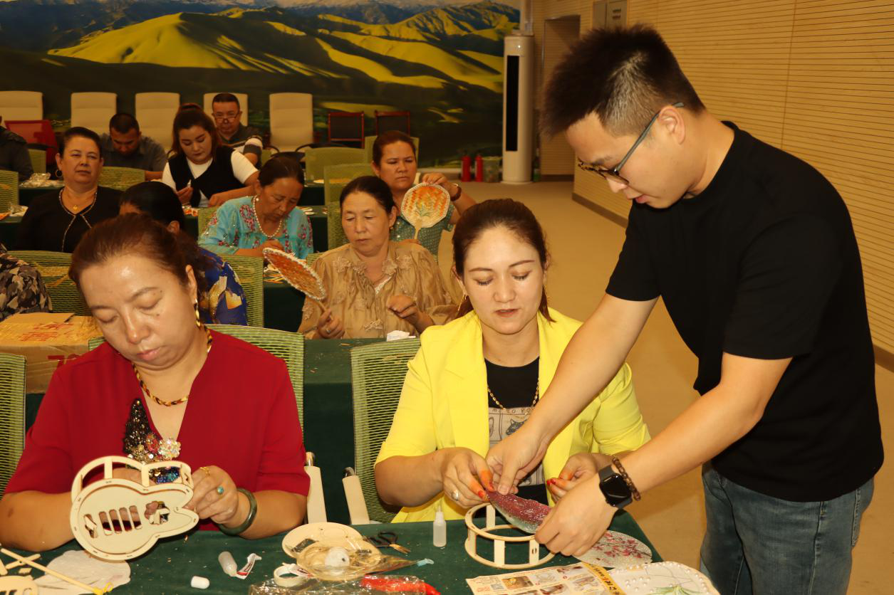 自治區(qū)文化館工作人員正在給群眾手把手的實(shí)操教學(xué)編織扇面。艾力江攝