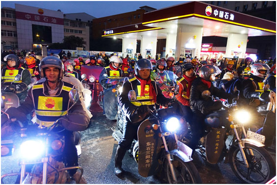 務(wù)工人員鐵騎春運首日返鄉(xiāng) 121座加油站免費加油