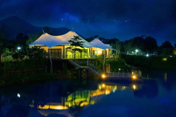 到了夜深人靜時分,溪龍的夜空是如此濃郁迷離,星光點點下,帳篷客度假酒店的昏黃人間煙火足以令人迷醉。醉人的光影充滿了童話般的色彩,10套單體帳篷式別墅仿佛成了仙境國的童話小屋。內(nèi)部的現(xiàn)代中式裝潢頗具禪意,客人透過落地窗便可以看見整片茶園,在夜色中傾吐靜謐的綠意。