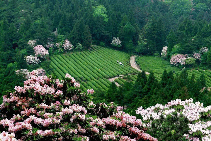 除了大片的茶園,天臺還有一絕,那就是云錦杜鵑花。特別是每年五月,云錦杜鵑盛開,漫山遍野,燦若云霞,成為一道綺麗的風景。華頂山上的云錦杜鵑與天臺云霧茶千百年和諧共存,花茶相映,特別壯觀。
