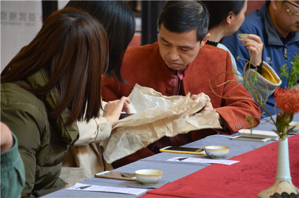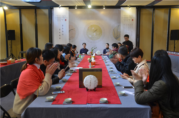 來自中山茶文化促進(jìn)會的茶友們一同品鑒了廣州市瑞豐實業(yè)發(fā)展有限公司的兩道茶:云南七子柑普餅茶和九六小黃印。第一道陳皮普洱餅茶經(jīng)普洱茶傳統(tǒng)工藝發(fā)酵,精心拼入上好陳皮絲,茶性溫潤平穩(wěn),理氣健脾,溫胃散寒??诟邢喈?dāng)醇厚,有點陳皮的香氣,非常清新,在寒冷的冬天里喝到這樣的茶令人心情愉悅;第二道九六小黃印,選自1996年的生普老茶新壓而成,原料存于云南西雙版納,是2016年壓制后送往廣東倉,口感醇厚,生津持久。聆樂的舒適、飲茶的愉悅和品茶的快感立即將茶友們帶至一個精妙絕倫的茶語世界,感受到中華茶文化的博大精深。