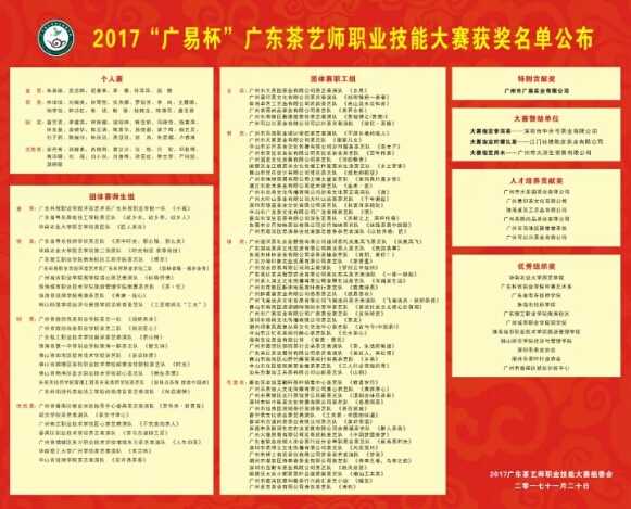 弘揚茶藝工匠精神,展示匠心文化風(fēng)采。經(jīng)廣東省人力資源和社會保障廳批準(zhǔn),由廣東省職業(yè)技能鑒定指導(dǎo)中心提供技術(shù)指導(dǎo),廣東省茶業(yè)行業(yè)協(xié)會主辦,廣州市廣易實業(yè)有限公司、2017中國(廣州)國際茶業(yè)博覽會組委會共同承辦,各地市茶葉協(xié)會協(xié)辦的廣東省一類競賽項目——2017“廣易杯”廣東茶藝師職業(yè)技能大賽,于11月24日下午在廣州茶博會16.3展館舉行隆重的頒獎典禮。