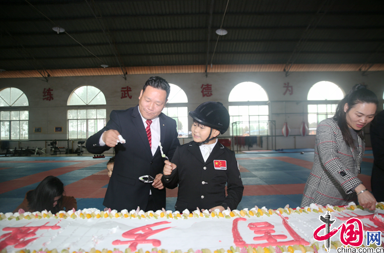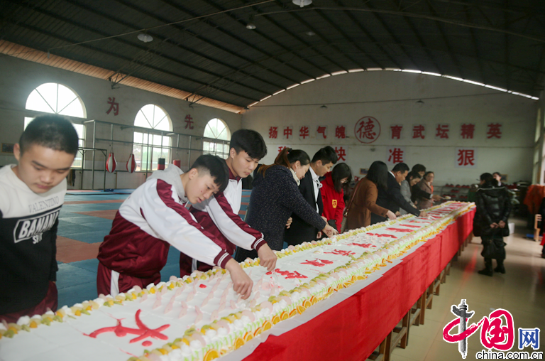 龍翔學(xué)校師生共同切蛋糕(蛋糕全長(zhǎng)15米,寓意龍翔學(xué)校15周年生日快樂(lè))