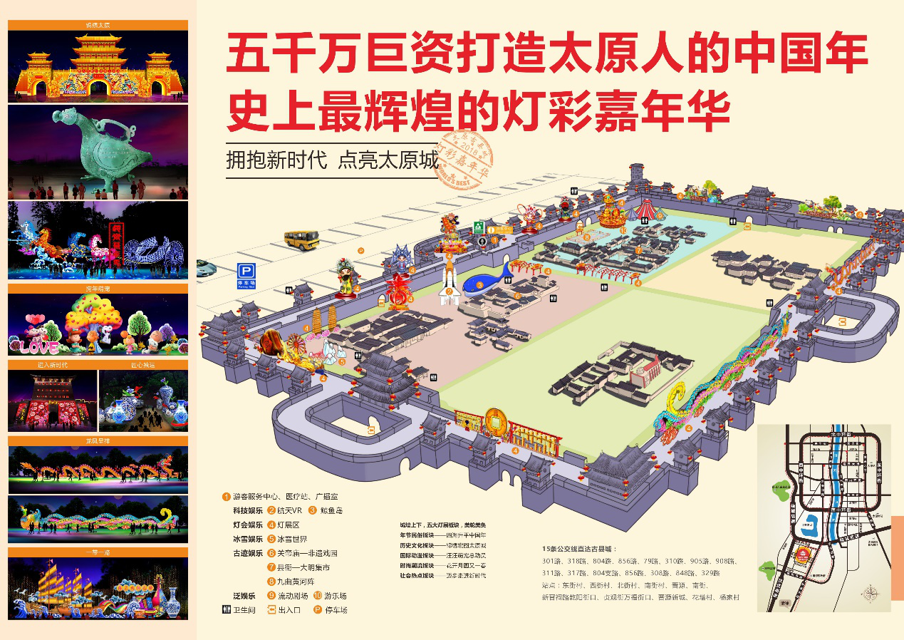 165個足球場那么大的燈彩主題公園,3.7公里城墻燈展,五大板塊,140組彩燈……當(dāng)自貢燈會與太原古縣城相遇,又會碰撞出怎樣的火花?2018年1月1日至3月8日,由G20環(huán)球燈會制作班底集結(jié)300名能工巧匠傾力打造的“2018太原古縣城燈彩嘉年華”,將點(diǎn)亮這座有著600余年歷史的古太原縣城。