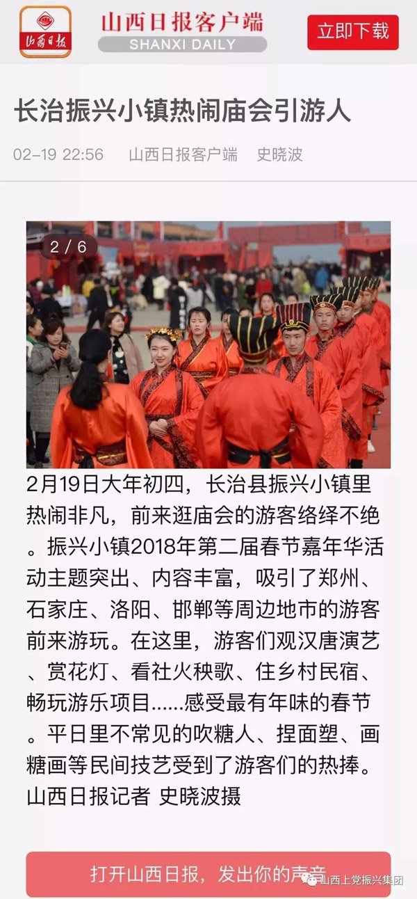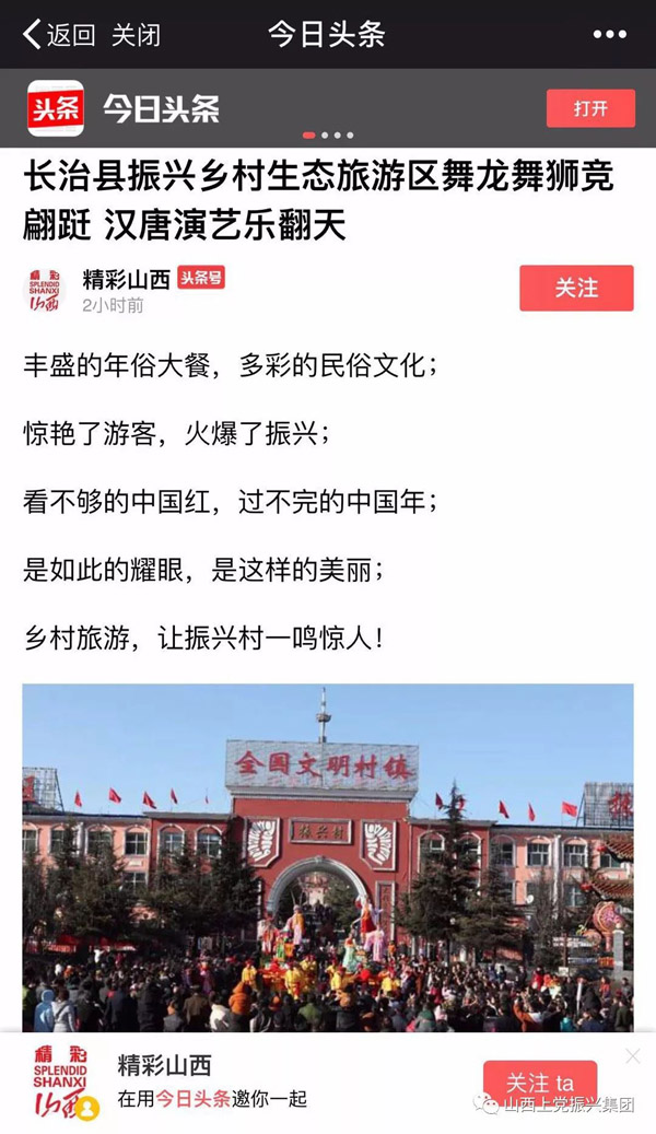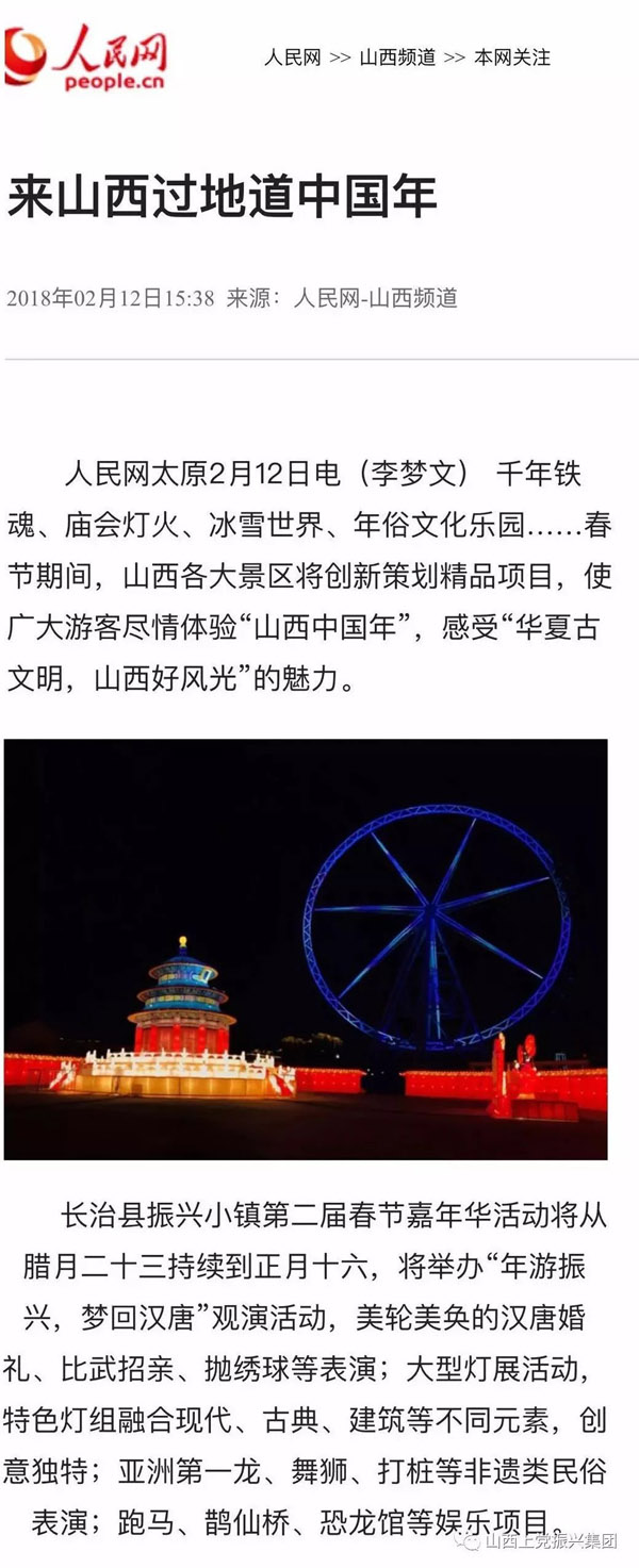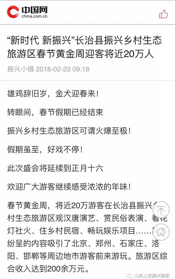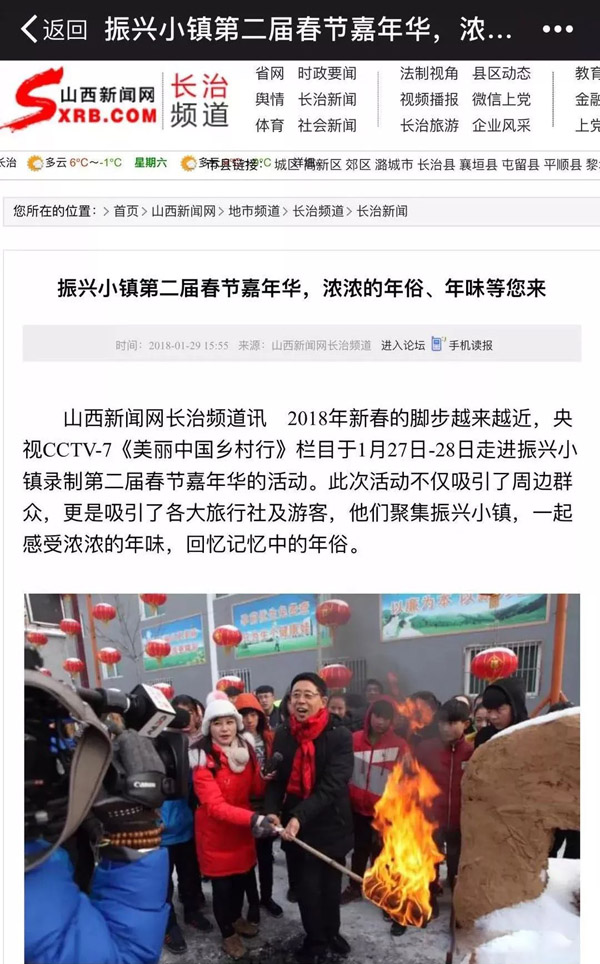 春節(jié)期間,振興鄉(xiāng)村生態(tài)旅游區(qū)為滿足游客需求,依托景區(qū)特色,打出民俗活動“創(chuàng)新牌”,吸引了眾多游客前來,景區(qū)每日紅紅火火,游客可謂人山人海,呈現(xiàn)一派喜慶、祥和、熱鬧景象。尤其是春節(jié)黃金周和元宵佳節(jié),游客猛增,景區(qū)除停車場爆滿外,來自各地的私家車在景區(qū)外的旅游路兩側(cè)排成了長龍陣,熙熙攘攘的人流讓人感受到了濃濃的年味。此外,央視、中國網(wǎng)、人民網(wǎng)、新華網(wǎng)、新浪網(wǎng)、騰訊網(wǎng)、今日頭條、山西衛(wèi)視、山西日報、山西新聞網(wǎng)、黃河新聞網(wǎng)、網(wǎng)易、鳳凰、搜狐、晉城衛(wèi)視、長治衛(wèi)視等各大主流媒體,對此次活動進行了深度采訪報道。