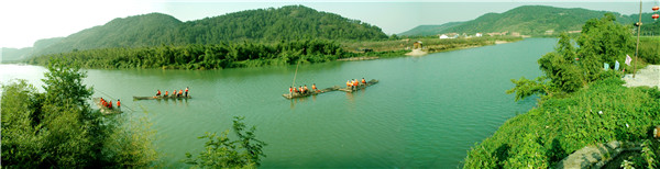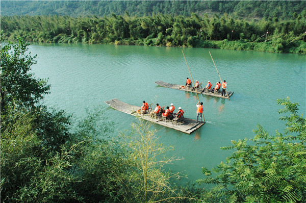 剡溪夾岸青山,草木蔥蘢。自古便是文人騷客們中意的景觀長廊。山溪澗流匯入江中,其勢或奔瀉急湍,或潺潺流淌。江水淺處為灘。溪流深處為潭。名勝景點珠璣散布,粲然可觀。撐一桿竹筏,背一首唐詩,做幾個深呼吸,保證叫你不知今夕何夕,頓生超然脫俗的妙意。