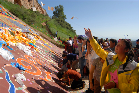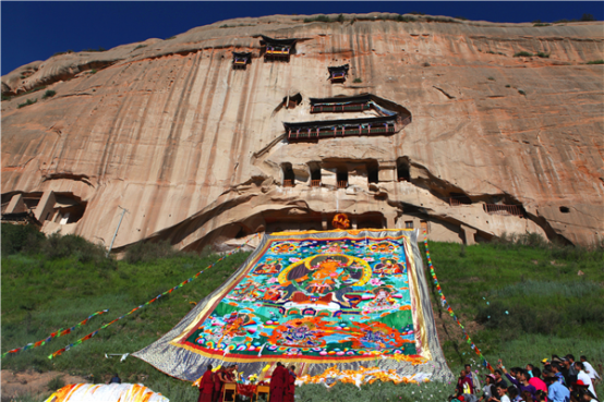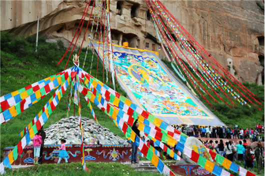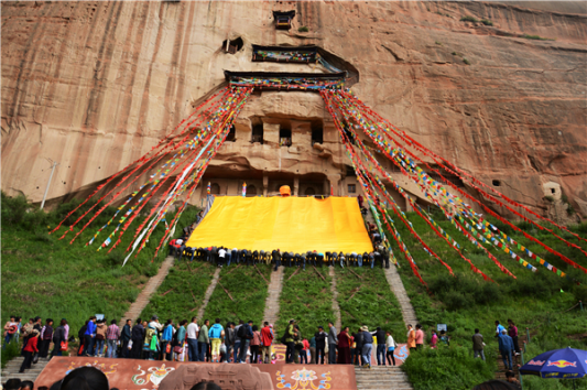 “曬佛”就是僧眾們從寺廟中將畫著佛像的唐卡請出,虔誠地將佛像抬起來掛到“三十三天”石窟的曬佛臺上,讓大家觀瞻膜拜。虔誠的信眾對佛像磕頭膜拜,為佛像敬獻哈達和貢品,祈求佛保佑人們平安健康,吉祥如意。