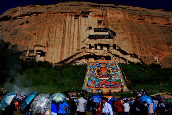 每年農(nóng)歷六月十五是藏傳佛教圣地馬蹄寺曬佛、祭鄂博等宗教活動的日子,這場盛大的視覺盛宴即將到來。節(jié)會期間,僧眾面對著展示的佛像以祈求佛保佑人們平安健康、吉祥如意、風(fēng)調(diào)雨順、五谷豐登。當(dāng)日,來自青海、西藏和當(dāng)?shù)氐慕f民僧俗民眾和游客慕名前來參加佛事活動。