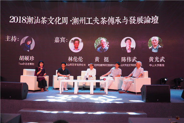 論壇進(jìn)入到嘉賓對(duì)話環(huán)節(jié)。主持人黃波秘書長(zhǎng)將潮學(xué)專家黃挺、韓山師范學(xué)院校長(zhǎng)林倫倫、中山大學(xué)古文字研究所所長(zhǎng)陳偉武、中山大學(xué)中文系教授黃光武四位先生請(qǐng)至臺(tái)上就座,臺(tái)灣《Tea》雜志總策劃胡碩珍女士主持對(duì)話。這是一個(gè)不同以往的跨界“組合”,這四位長(zhǎng)期在高校工作并在各自研究領(lǐng)域取得豐碩成果的學(xué)者,雖非茶行業(yè)的專業(yè)人士,卻都因?yàn)槌鄙侨说年P(guān)系,從小耳濡目染,而對(duì)潮州工夫茶有一份與生俱來的情結(jié)。而同為文化人的特質(zhì),又使得四位學(xué)者與胡碩珍女士對(duì)工夫茶的認(rèn)識(shí)與理解不僅僅止步于生活的、家常的層面。