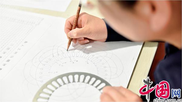 印象最深的是研發(fā)一種新型六極電機時,4米長圓柱形的殼體,內(nèi)孔面積只有巴掌大,一圈有36個槽孔,每個孔要穿15根銅線,大家看了設(shè)計都說這簡直是極限挑戰(zhàn)!我們一遍遍地做走線的實驗,幾天也沒有一點兒進展。有些人開始絕望:“這個設(shè)計沒法干,趕緊改設(shè)計吧?!钡俏蚁?,設(shè)計在理論上成立,如果我們下線穿不過去,就意味著研發(fā)有可能失敗,所以必須得干成!晚上回家,我睡不著覺,半夜起來找出資料仔細琢磨,畫了50多幅走線工藝圖紙。為了解決兩端造型上的難題,我嘗試著畫了一種“九瓣梅花”的端部造型圖。經(jīng)過反復(fù)實驗,這個下線方法成功了!看著三相電磁線一相壓著一相,緊湊而整齊,就像精美的“十字繡”!當時我那個心情比給我發(fā)多少獎金都高興。