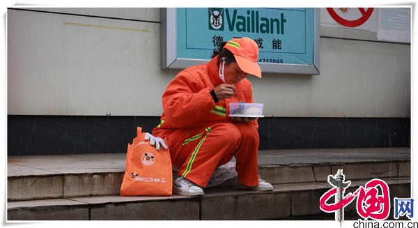 這張照片是我剛到龍?bào)粗新芳佑驼緯r(shí)拍下的。照片中的這個(gè)環(huán)衛(wèi)工人,和我的母親年齡相當(dāng)??匆娝龝r(shí),她正在吃飯。當(dāng)時(shí),已經(jīng)是下午2點(diǎn)多鐘??梢钥隙?,她吃的一定不是晚飯。那天,天氣特別的寒冷,她就這么一個(gè)人孤零零的坐在寒風(fēng)中的路牙上,我在想,她會(huì)是誰的母親?又會(huì)是誰的家人呢?