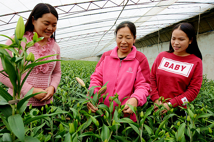 都說(shuō)萬(wàn)事開(kāi)頭難,一些人對(duì)鮮切花種植不敢貿(mào)然行事、猶豫、心存疑慮,生怕“賠了夫人又折兵”?!案咝r花種植雖有風(fēng)險(xiǎn),但高回報(bào),一棟百合從種到收短短4個(gè)月時(shí)間可收入四、五萬(wàn)元,是種植傳統(tǒng)糧食的幾十倍?!被ù蠼闵朴谧约撼晒?jīng)驗(yàn)和擴(kuò)大種植規(guī)模來(lái)影響和帶動(dòng)姐妹,并承諾全力當(dāng)好大伙的技術(shù)員、輔導(dǎo)員。有了花大姐這個(gè)技術(shù)靠山,姐妹們的心動(dòng)起來(lái)了,燃起了籌措資金建造溫室大棚的“燎原之火”,發(fā)展鮮切花種植成為當(dāng)?shù)刎毨丝诰珳?zhǔn)脫貧、姐妹發(fā)家致富的首選項(xiàng)目。據(jù)悉,目前雙鎮(zhèn)鎮(zhèn)已連片建成高標(biāo)準(zhǔn)溫室大棚3000余棟,種植面積擴(kuò)至1.6萬(wàn)畝,有2000多人“上班”進(jìn)花棚,年銷(xiāo)售鮮切花銷(xiāo)售產(chǎn)值5億元,成為中國(guó)鮮切花第一種、中國(guó)花木之鄉(xiāng)。