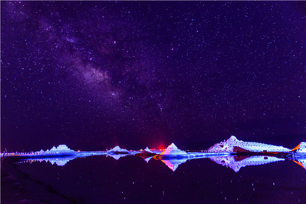 神奇的北緯36度一直是觀星愛好者神往的地方,而茶卡鹽湖恰恰位于觀星最佳維度線上,3059米的海拔讓茶卡鹽湖規(guī)避了底層大氣中塵埃、水汽和煙霧的影響,遠離城市沒有光污染,這為茶卡鹽湖觀星創(chuàng)造了極佳的條件。夜幕來臨,茶卡鹽湖上空星光明亮而燦爛,浩瀚銀河仿佛從天空傾瀉而下,璀璨星空落入平靜的湖面,好似珠寶散落天際。夜晚走在茶卡鹽湖,頭上繁星點點,腳下星空漫漫,仿佛童話世界般夢幻而奇特,“中國最美星空”由此得名。2014年9月《中國家地理》解密中國最美“夜空之鏡”,夜晚的茶卡鹽湖如鏡,星軌如絲,令人驚艷的“運動繁星”群像得到了最多的贊賞,它呈現(xiàn)出了一種嶄新的,欣賞星光之美的方式,并當選為《中國國家地理》雜志封面。