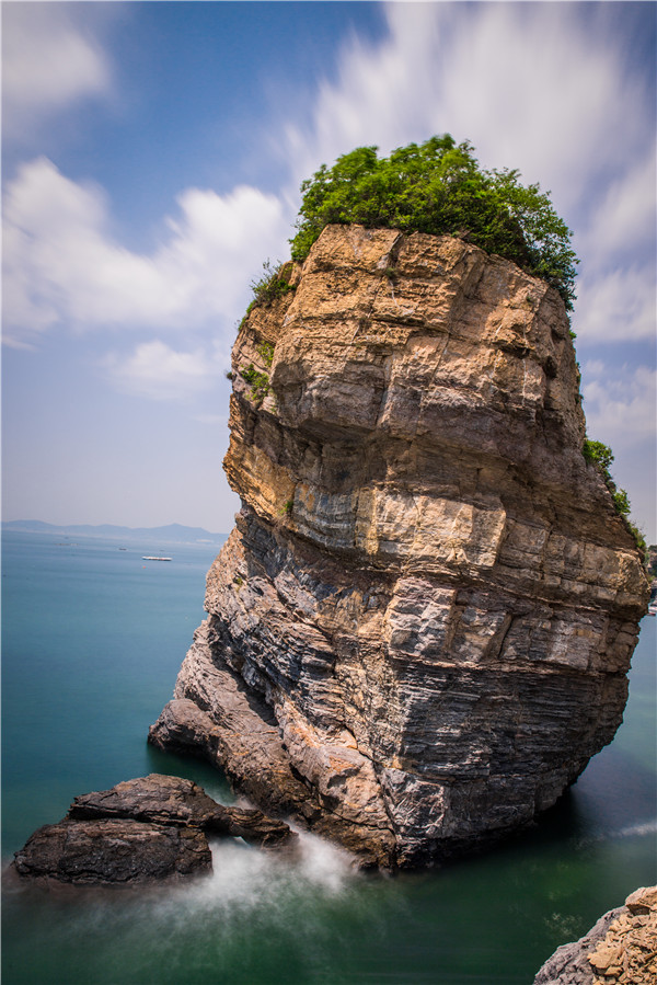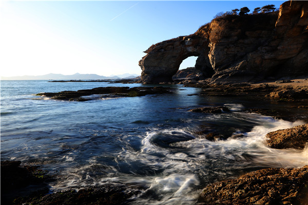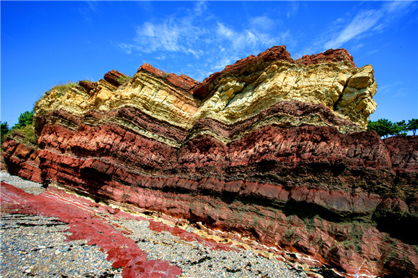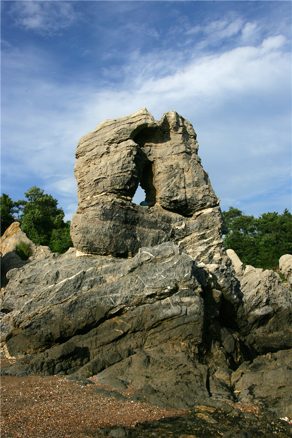 金石灘“因石而成名”,在東部景區(qū)海岸線,凝聚了3-9億年地質(zhì)奇觀,誕生于六億年前的震旦紀、寒武紀巖石形成壯麗的奇石景觀,被稱為“凝固的動物世界”、“天然地質(zhì)博物館”、“神力雕塑公園,2012年,恐龍?zhí)胶>坝^被美國CNN評為中國最美的40個景點之一。