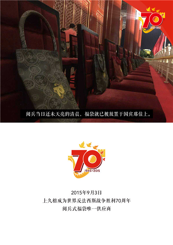 2015年9月3日,上久楷成為抗戰(zhàn)勝利70周年閱兵式福袋唯一供應商。在設(shè)計與織造的過程中,經(jīng)過數(shù)十次工藝改進和打樣設(shè)計,最終確定產(chǎn)品制作方案。從織造、裁剪、繡花、縫紉、成品,再到禮品盒的設(shè)計與包裝,歷經(jīng)多番艱辛,才讓宋錦再次以“福袋”的形式亮相在世界舞臺,讓傳統(tǒng)文化元素在閱兵儀式上大放華彩,為打響民族絲綢品牌邁出新步伐。