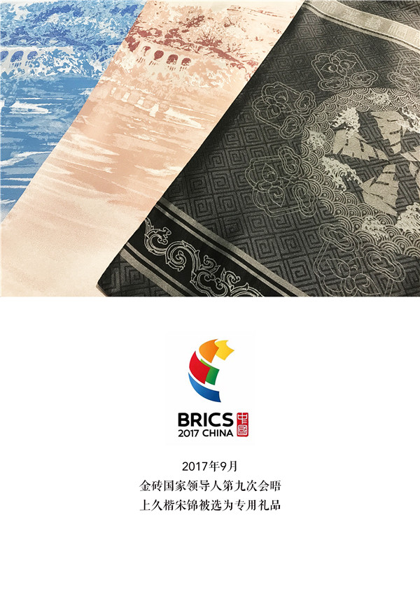 2017年9月,上久楷“宋錦福船系列”被選為金磚峰會國賓禮品組合。其研發(fā)團隊由著名設(shè)計師曾鳳飛帶領(lǐng),耗時半年,從產(chǎn)品設(shè)計、研發(fā)到面料、花紋的選擇,每一細節(jié)都嚴格把控,層層篩選,最終以獨特的匠心和宋錦面料在競爭對手中,脫穎而出、再獲殊榮、博得世界矚目!
