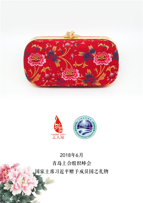 2018年6月,上久楷“華玉丹祥宋錦晚宴包”入選“和合共生”國禮套裝被獻給來自上海合作組織成員國元首理事會第十八次會議上的各成員國成員。“華玉丹祥宋錦晚宴包”作為中國傳統(tǒng)文化和世界非遺文化的代表作與“合和共生”國禮相呼應,汲取傳統(tǒng)工藝元素,運用中國特色材質(zhì),設(shè)計上則采用牡丹圖案與中國刺繡相輔相成,連理相依的系列配飾讓這份國禮莊重而不失雅致,該作品也寓意著國家繁榮昌盛、美好幸福的祝愿,透露出了上久楷對宋錦產(chǎn)品源源不斷的創(chuàng)新精神與民族情懷,以匠心鑄造每一件宋錦精品。