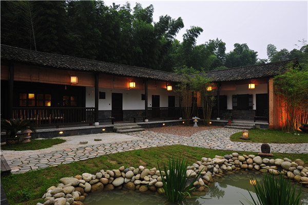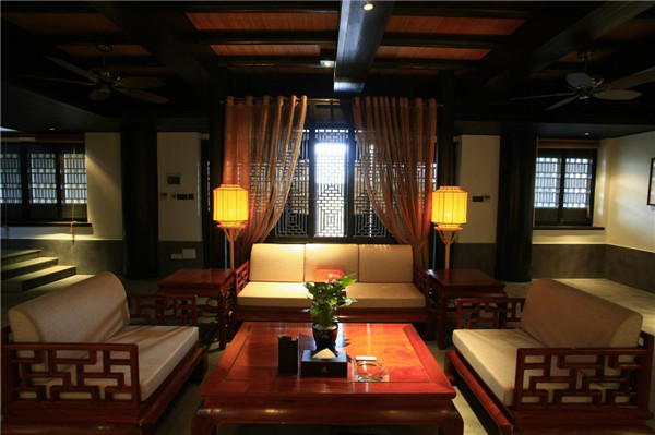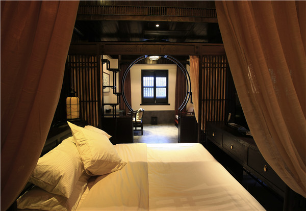 客房別墅意在還原18世紀(jì)中國民居院落。黃墻黛瓦、庭院深深,體驗(yàn)一種無線親近自然的禪意生活。正像陶淵明在《歸田園居》中描寫的一樣“久在樊籠里,復(fù)得返自然”。