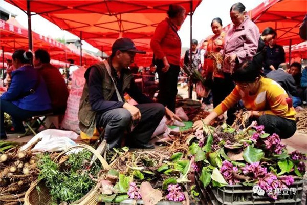 會(huì)理的端午節(jié)獨(dú)具特色,稱端午節(jié)為“端陽節(jié)”,并有“一月兩端陽”的傳統(tǒng)習(xí)慣,農(nóng)歷5月5日為“小端陽”,傳統(tǒng)習(xí)俗除插蒲艾,飲雄黃酒,吃大蒜、鹽蛋、包子、粽子外,家家戶戶都沿襲著端午節(jié)吃“藥根湯”的傳統(tǒng)習(xí)俗,用鮮沙參、玉竹、黃精等燉肉食用。農(nóng)歷四月底五月初,會(huì)理縣城周圍的農(nóng)民群眾紛紛上山采挖沙參、泡參、玉竹、仙茅、透骨草、牛蒡根、牛口刺等上百種宜于燉食、洗浴的藥根,運(yùn)到縣城內(nèi)出售,在會(huì)理古城內(nèi)的大街小巷擺起藥市,青磚碧瓦下、古街古道旁,擺滿了各種各樣新鮮的草藥根,場面既有一種天然質(zhì)樸的和諧之美又令人感到震撼。其他鄉(xiāng)鎮(zhèn)集市也如此,藥香滿街,人如潮涌,形成了極有特色的端午藥市,持續(xù)近二十天,一直到農(nóng)歷5月15日“大端陽”過后方散。端午節(jié)當(dāng)天,人們紛紛到街頭藥市,挑選最為新鮮的藥根,回家刮洗浸泡后與土雞、火腿、豬蹄等共同置于砂鍋煨燉“藥根湯”,淡淡的藥味混著肉香,湯鮮味美,是會(huì)理人端午節(jié)餐桌上的明星,也是會(huì)理人的鄉(xiāng)愁,用會(huì)理話講就叫做“吃藥根根”。據(jù)考證,會(huì)理獨(dú)特的端午風(fēng)情傳承于諸葛亮南征。史籍上記載:諸葛亮南征,“五月渡瀘,深入不毛”,并“首戰(zhàn)于會(huì)無”。會(huì)無就是今天的會(huì)理。據(jù)說,諸葛亮率兵進(jìn)入會(huì)理時(shí),因時(shí)至五月,天氣炎熱,士兵們因水土不服而造成傷口感染、腸胃不適。諸葛亮在當(dāng)?shù)乩习傩盏闹敢律仙讲赏诹烁鞣N草藥根,有的熬湯洗、有的燉了吃,士兵們很快就痊愈了,而在農(nóng)歷五月挖藥根、吃藥膳的習(xí)俗也在會(huì)理傳承了下來。