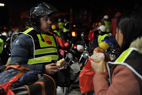 21日凌晨,中國(guó)石油泉州荊山加油站內(nèi),鐵騎們正在享用油站提供的早餐。