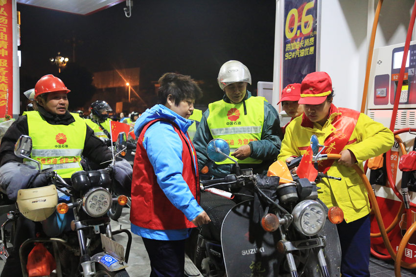 1月21日清晨,中國(guó)石油泉州荊山加油站,志愿者正在為準(zhǔn)備啟程返鄉(xiāng)的鐵騎免費(fèi)加油。