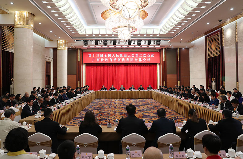 3月3日下午,出席第十三屆全國(guó)人民代表大會(huì)第二次會(huì)議的廣西壯族自治區(qū)代表團(tuán)在駐地北京廣西大廈舉行第一次全體會(huì)議。