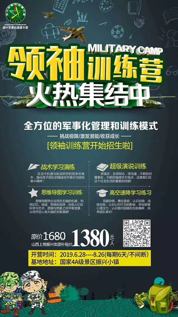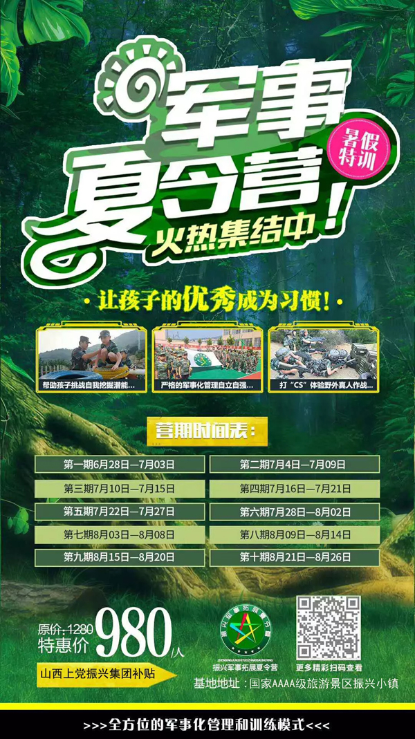 振興軍事夏令營包括軍事夏令營及領(lǐng)袖特訓(xùn)營兩種,面向7-15歲中小學(xué)生招生,預(yù)計舉辦十期,每期六天五夜。