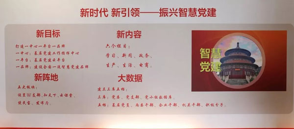 振興智慧黨建的新目標(biāo)是:打造一中心一平臺一品牌。一中心:基層黨建工作指揮中心,一平臺:基層黨建云平臺,一品牌:建設(shè)全國一流智慧黨建品牌。振興智慧黨建新陣地,五大板塊:設(shè)置W支部、知天下、云課堂、便民寶、發(fā)布廳。振興智慧黨建新內(nèi)容,六個欄目:學(xué)習(xí)、新聞、政務(wù)、生產(chǎn)、生活、電商。振興智慧黨建大數(shù)據(jù),建立三庫五檔:三庫:黨委、黨支部、黨小組數(shù)據(jù)庫。五檔:基層黨員、兩委干部、企業(yè)干部、機關(guān)干部、積極分子。